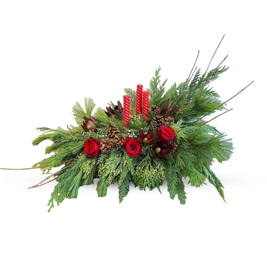 Enjoy the holiday season with this absolutely iconic winter centerpiece! Red roses draw the eye against a long lasting background of dried accents and holiday greenery.