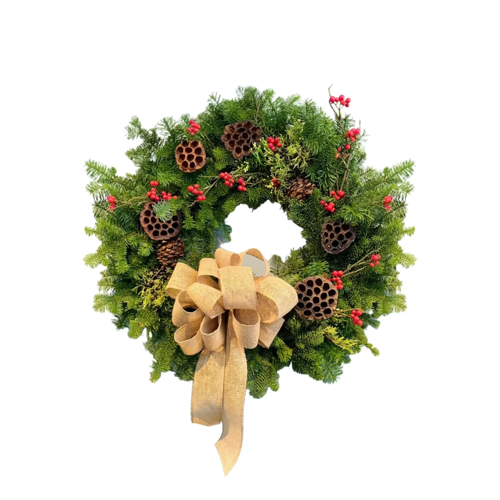 A timeless Christmas decoration! This holiday staple is decorated with a variety of dried accents including pinecones and lotus pods, silk ilex berries, and a rustic burlap bow!