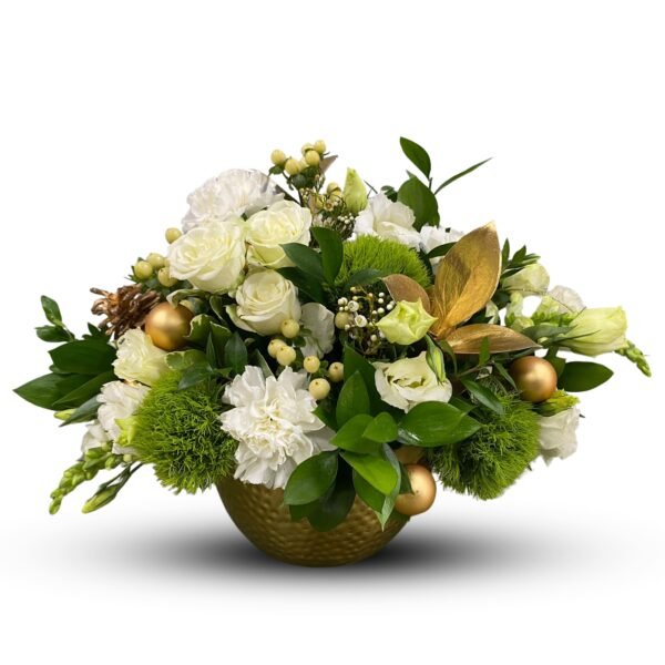 Whites and greens provide a stunning backdrop for the pops of gold in this discerning holiday arrangement.
