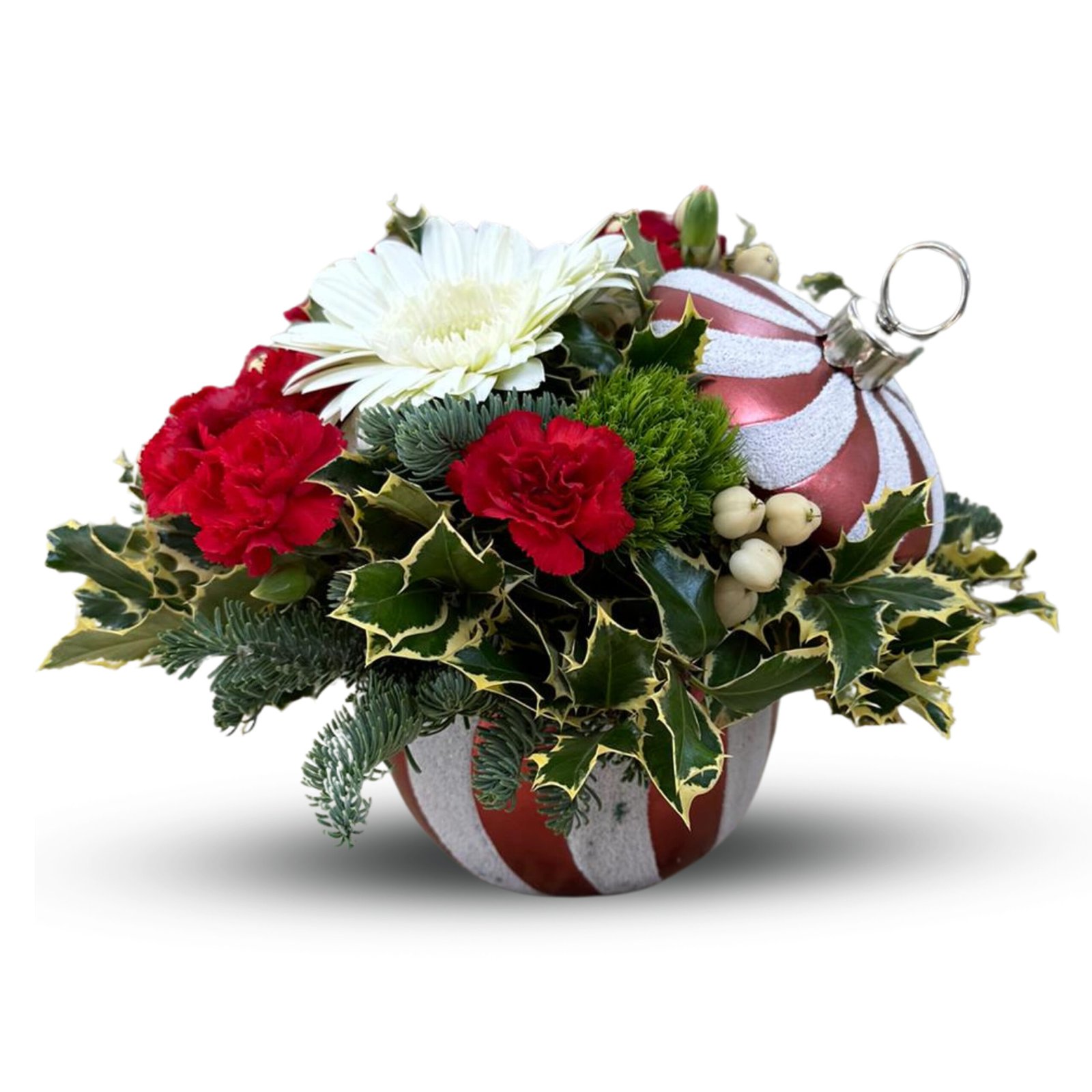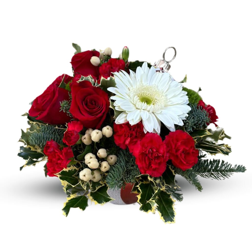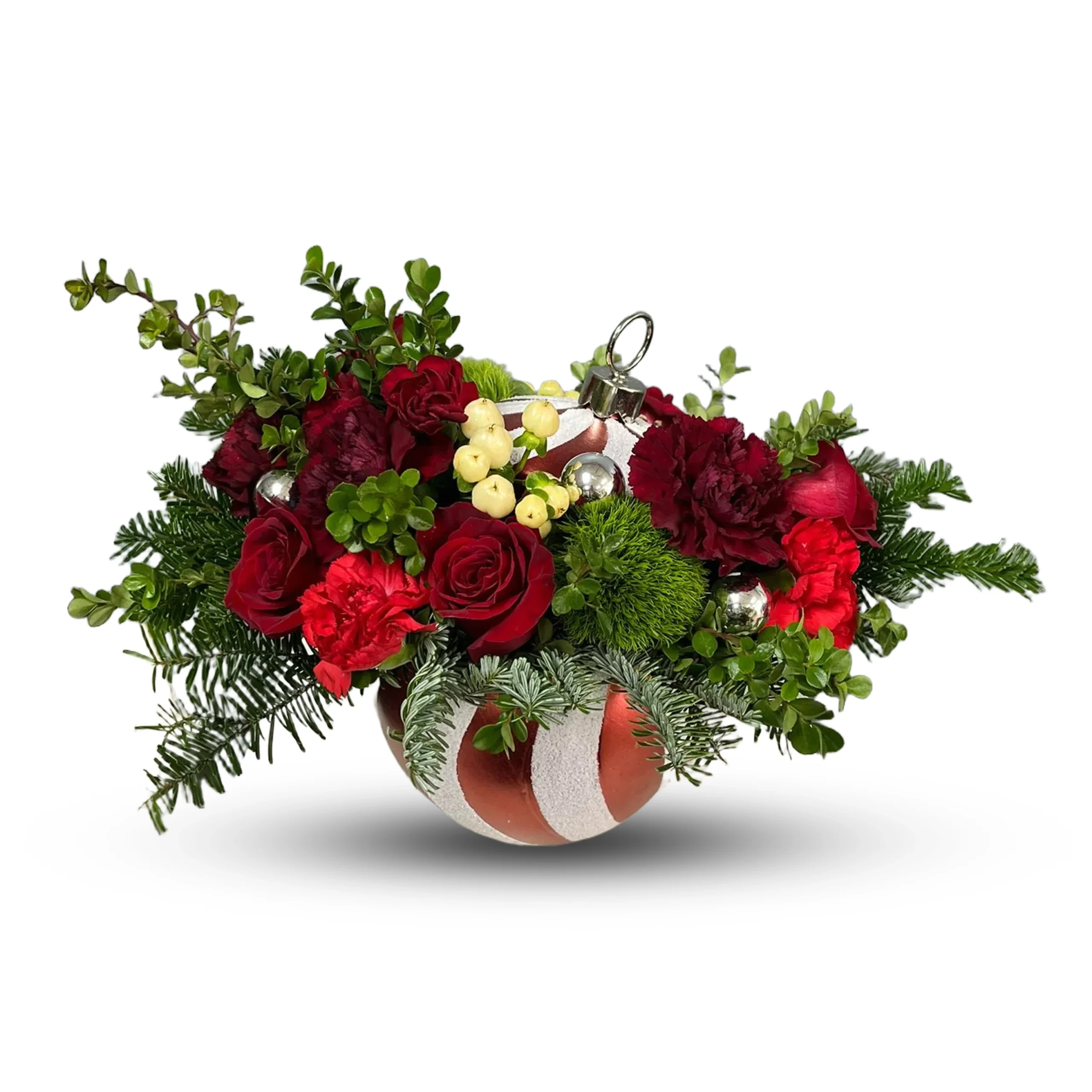 A swirl of red and white flowers complimented by fir make for a classic Christmas arrangement! It also comes in a keepsake ceramic ornament that you can keep for the whole holiday season.