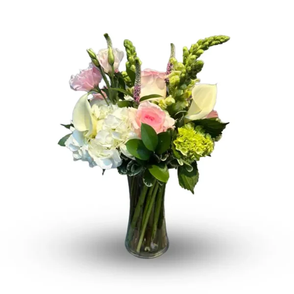 A pretty in pink arrangement featuring light pink hydrangea, light pink roses, light pink lilies, peach spray roses, and white snapdragons.