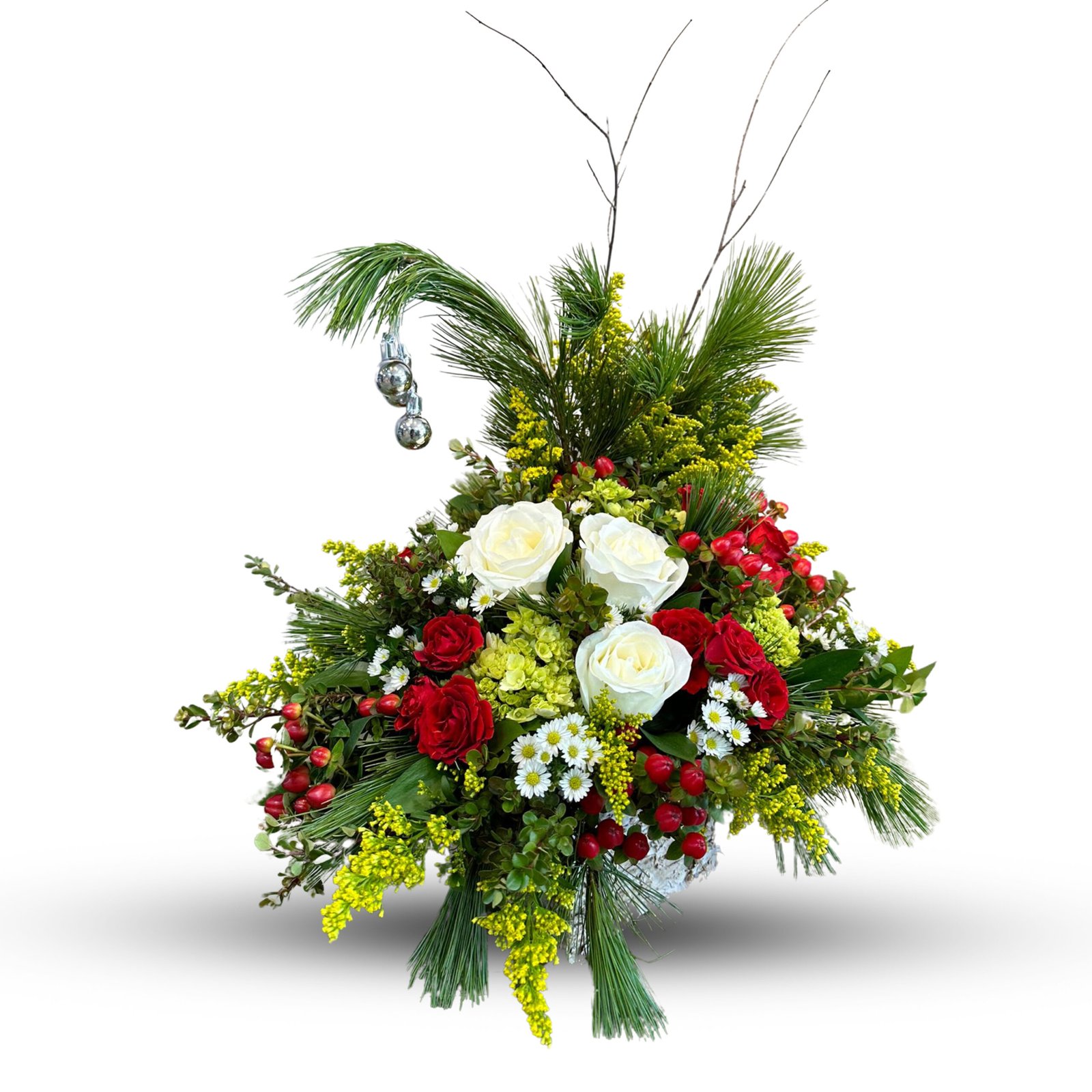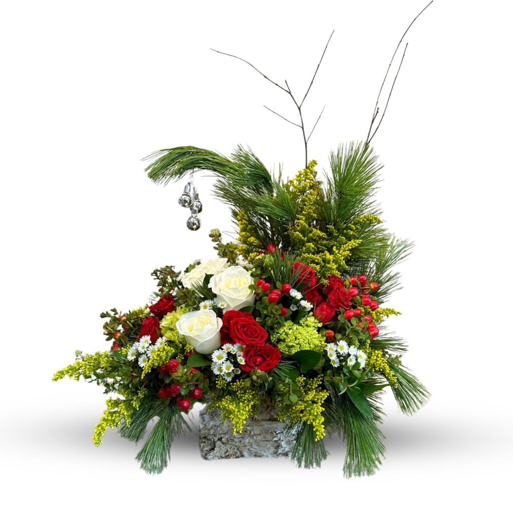 An arrangement sure to make anyone’s heart grow three sizes! The stunning reds, whites, greens, and yellows in this piece are complemented by fir branches and silver baubles.