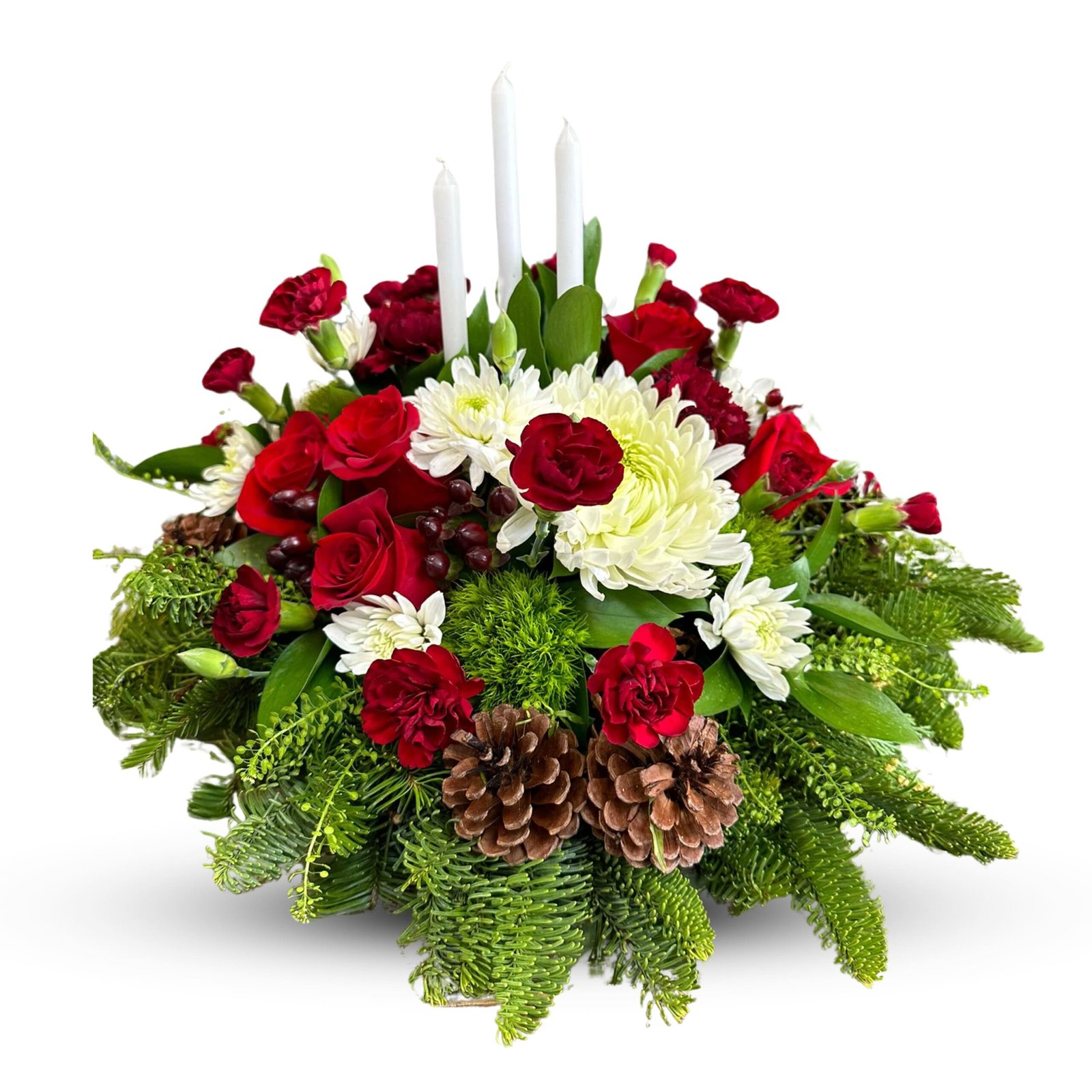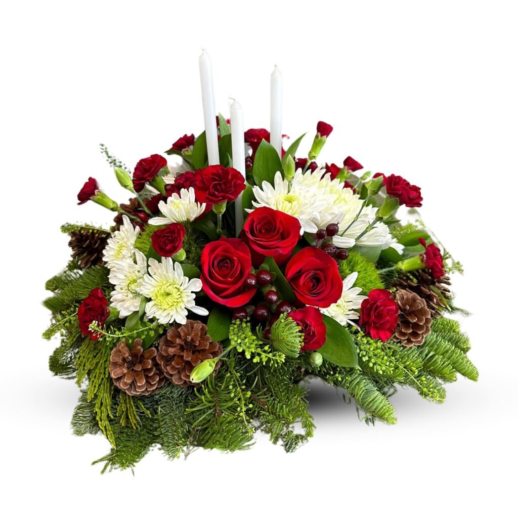 Gather round and enjoy the flickering candles in this gorgeous centerpiece! This arrangement is made of a 16” fir wreath and accented with a variety of blooms and greenery to make something truly special to celebrate the holidays with.